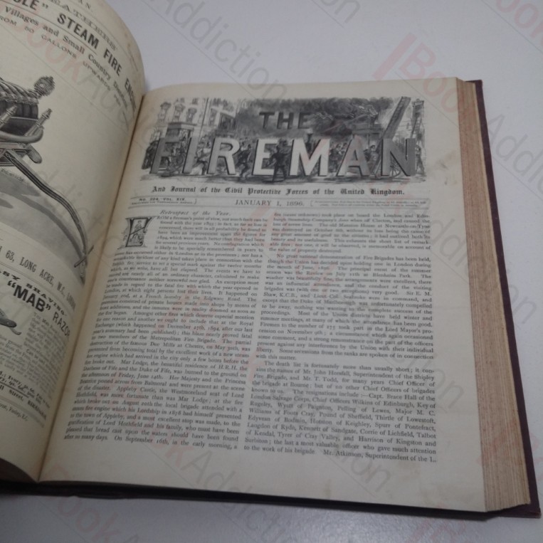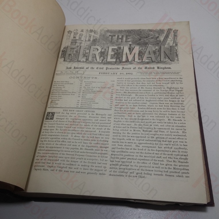 All issues of the monthly journal The Fireman and Journal of the Civil Protective Forces of the United Kingdom from February 1892 to June 1897, bound into a single volume.  Quarter bound in deep red leather over deep red cloth-covered boards.  Speckled edges.  4to.  Covers are a little rubbed at edges, with a few small chips, mildly marked and slight sunned over spine.  Endpapers slightly soiled around edges, hint of page toning and occasional signs of handling.