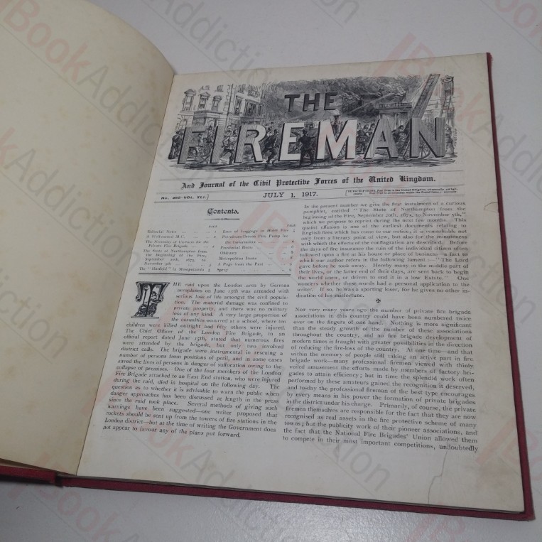 All issues of the monthly journal The Fireman and Journal of the Civil Protective Forces of the United Kingdom from July 1917 to June 1918, bound into a single volume. Red cloth-covered boards, gilt design on front, gilt lettering on spine. 4to. Cloth covers a little rubbed at edges, rubbed and rounded on corners and spine ends, a little soiled in places, spine a little sunned. Hint of spotting on endpapers else internally neat, clean, bright and tight.