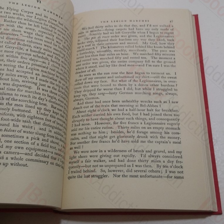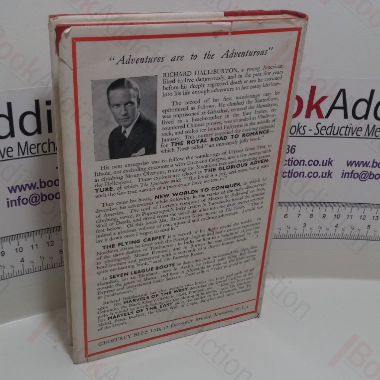8th printing. 266pp plus central section of plate illustrations. Coloured maps on endpapers. In red cloth boards with black lettering on spine (boards are very slightly faded, with a hint of rounding at spine ends). Internally neat, clean and bright barring some light toning on endpapers. Tight and square. In its original dust jacket, lightly chapped along upper edge, a little worn on other edges, with small nick at base of a lightly sunned spine. A record of Halliburton’s flight around the world in his ‘Flying Carpet’, and during which he lived with the Foreign Legion and had a strange encounter with slave dealers in Timbuctoo; flew to a height of 18000 feet to photograph Mount Everest; and was entertained by head-hunters in Borneo.