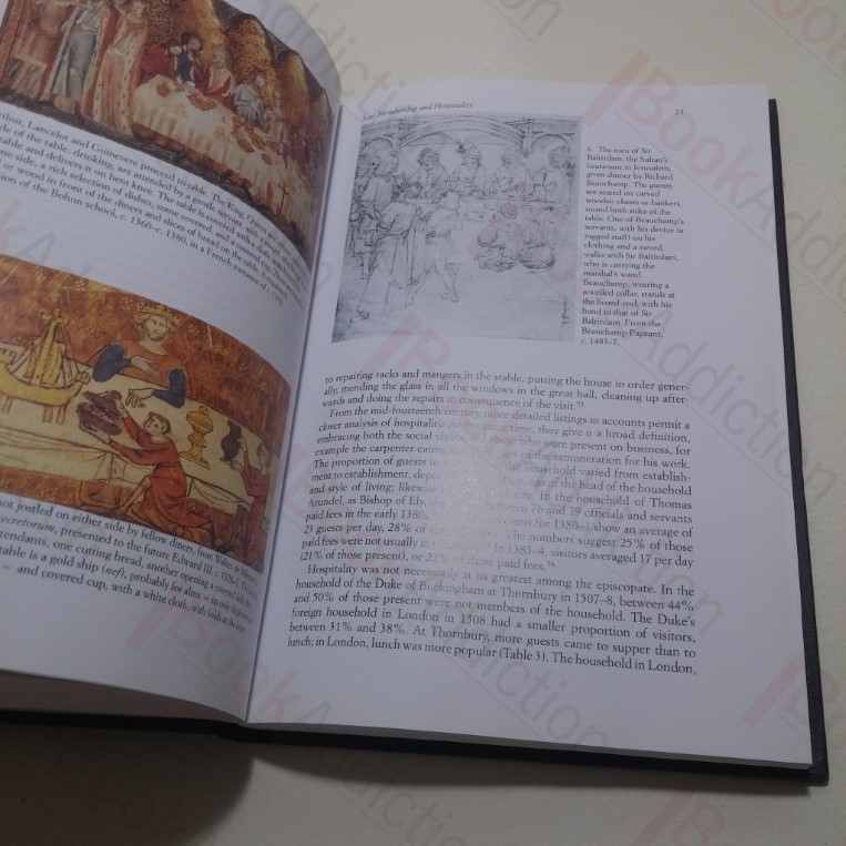 254pp, colour and black and white illustrations throughout. In black cloth-covered boards with gilt lettering on spine (cloth a little rounded at spine ends). Top edge dust marked. Internally neat, clean, bright and tight. In its original dust jacket (lightly bumped and rubbed at edges, small nick at base of spine). A portrait of aristocratic and gentry life in medieval England, looking at family life, the position of servants, the uses of space within the household, how meals were prepared and consumed both for daily sustenance and for special occasions and celebrations, clothing, travel arrangements etc.
