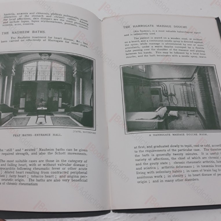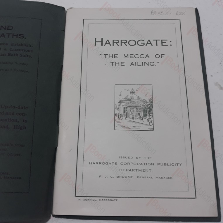 Not dated but internal evidence suggests c. 1910. Green card covers (slightly worn at edges). Numerous black and white illustrations with text and page decorations in green. Some oxidization around staples, and very gently worn at edges, else neat, clean, bright and tight. Primarily written to promote the medicinal qualities of Harrogate’s spa waters and treatments to patients seeking ‘The Harrogate Cure’; with detailed descriptions of the various springs, spas and treatments available, special qualities of the waters, duration of treatment and costs, and supporting scientific research. Lots of contemporary adverts for hotels, baths, gifts, local toffee etc.