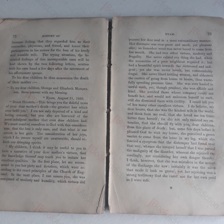 166pp. Soft cloth covered wraps with title label to front (heavily rubbed and worn, with some spine cracking). Copperplate hand ink marks to front endpapers. Binding holding but fragile, and page edges worn and soft, mild toning and a few marks. Overall a fair copy suitable for reading, research or rebinding. An account of how the village of Eyam, Derbyshire, was affected by an outbreak of plague in 1665/6, and the extraordinary measures the villagers took, under the leadership of a local priest, to prevent spread of the disease. Small, 12mo, volume.