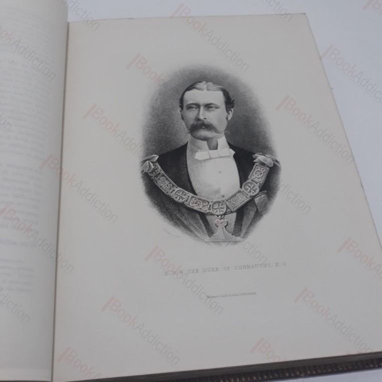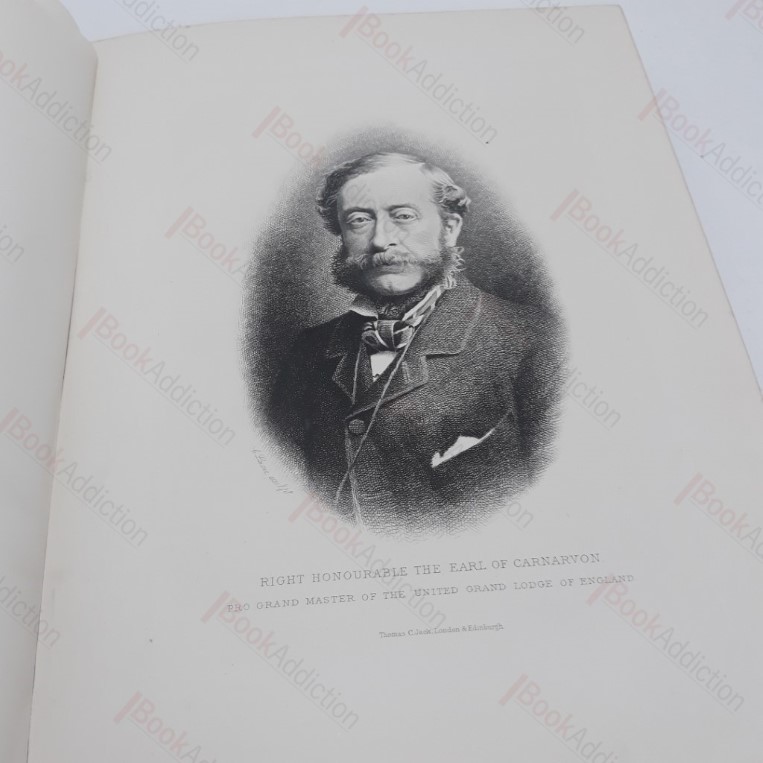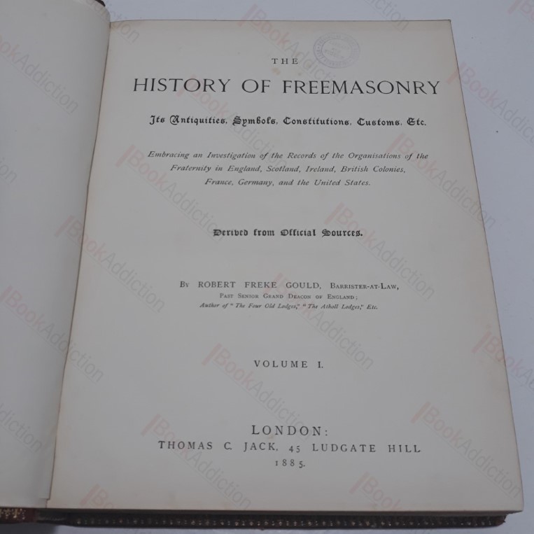 Complete in three volumes. 1885-7. [vi], 504pp; [ii], 502pp; [ii], 502pp. Each volume illustrated with tissue-guarded engraved plates (portraits, masonic seals etc – mostly monochrome but two of the plates towards the end of volume two are in colour). Three matching volumes bound in full red leather with gilt decorations and lettering, smooth bevelled edges, five raised bands to spine, all edges gilt, inner gilt dentelles, marbled endpapers. (Boards a little worn, rubbed and lightly scuffed on edges and around raised bands, with a few scattered marks and indentations, especially on the versos of volumes two and three. Previous owner’s inscription, dated 1888, in each volume, indicating that they were presented to the Provincial Grand Lodge Library, West Yorkshire. Small, occasional Grand Lodge Library stamps. There is also an inscription on the front free endpaper of volume one, which is faded along the leading edge. The gutter between the front endpapers of volume three has an sympathetic repair. Faint, occasional spotting. An imposing and handsome set. Gould’s history of Freemasonry is still considered one of the key authorities of the genre, it was re-issued several times, in various formats in the latter part of the 19th century. Large 4tos. A large and heavy set which will incur an additional charge for overseas delivery.