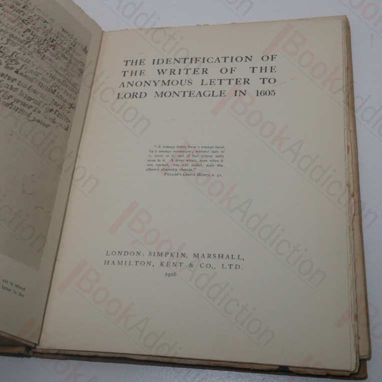 This is a scholarly work examining the anonymous 1605 letter to Lord Monteagle waring him not to attend the State Opening of Parliament on 5 November that year. The letter was a key factor in uncovering the Gunpowder Plot – the conspiracy to blow up the House of Lords and assassinate king James I. It analyses tehe handwriting and identifes the author as William Vavsour, an associate of Francis Tresham.