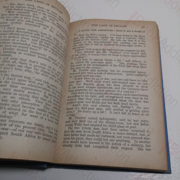 First edition, first printing [1916]. [iv, 288pp]. In blue cloth-covered boards, blind tooling, deep blue titles on spine (worn, faded at edges, rubbed and rounded at corners and spine ends, some marks). Pages toned throughout, else internally neat, and tidy. In its original, worn and torn dust jacket, with loss at both spine ends. Dust jacket now protected in an archival quality Mylar wrapper, fitted without the use of tape or adhesives. 12mo. A romance novel. David Lyall was one of the pen names of Annie S Swan, one of the most popular authors of the late 19th and early 20th centuries, with over two hundred novels to her name. She was also a suffragist, a Liberal activist and founder member and vice-president of the Scottish National Party. The Land of Beulah is one of her later novels and now quite hard to find, especially in a dust jacket as this one is.