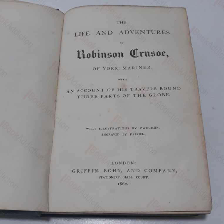 [3] 4-620pp. Engraved frontispiece and seven further engraved plate illustrations, from drawings by Zwecker and engraved by Dalziel. Buckram cloth boards, embossed, with gilt decoration and lettering (cloth a little worn all over, mild mottling and rubbed at corners and spine tips). Gutter strained between endpaper, contemporary inscription on front endpaper, dated 1863, pages toning at margins, library stamp on reverse of title page – no other library markings, occasional small mild marks on pages, a tad offset). A lovely, early edition with good illustrations of this classic story of isolation and survival.