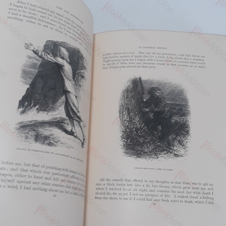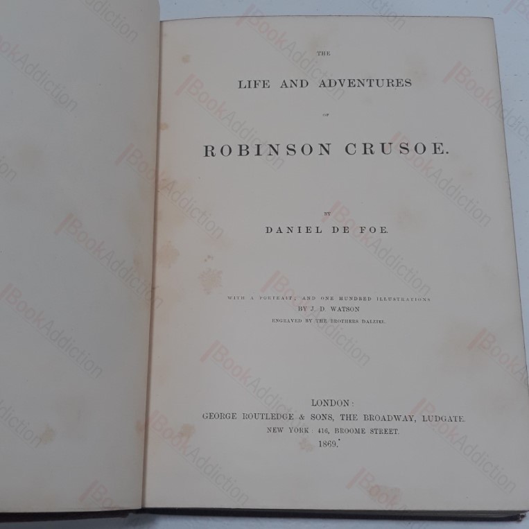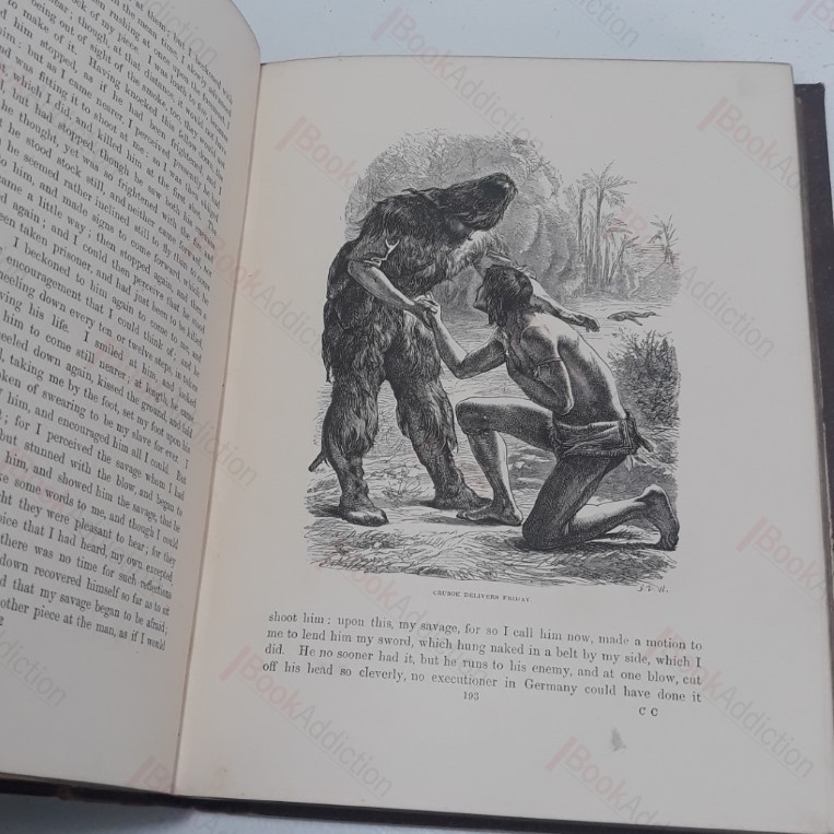 xx, 498, [2] pages. Portrait of Defoe for frontispiece and 100 illustrations by J D Watson, engraved by the Brothers Dalziel. (See Houfe, p 342.) Full Victorian decorated tan cloth binding, blind embossed and elaborate gilding, bevelled edges, all edges gleamingly gilded (boards a just a little rubbed at corner points, mildly bruised at spine tips). Original creamed yellow front endpapers. Previous owner’s inscription on front free endpaper, dated 1870; faint occasional spotting on prelims, first signature very slightly loosening at base only. Watson’s illustrations for Robinson Crusoe were first published by Routledge in 1864. A very good copy of this beautiful edition of Defoe’s classic tale. A large and heavy volume which will likely incur an additional charge for overseas shipping.
