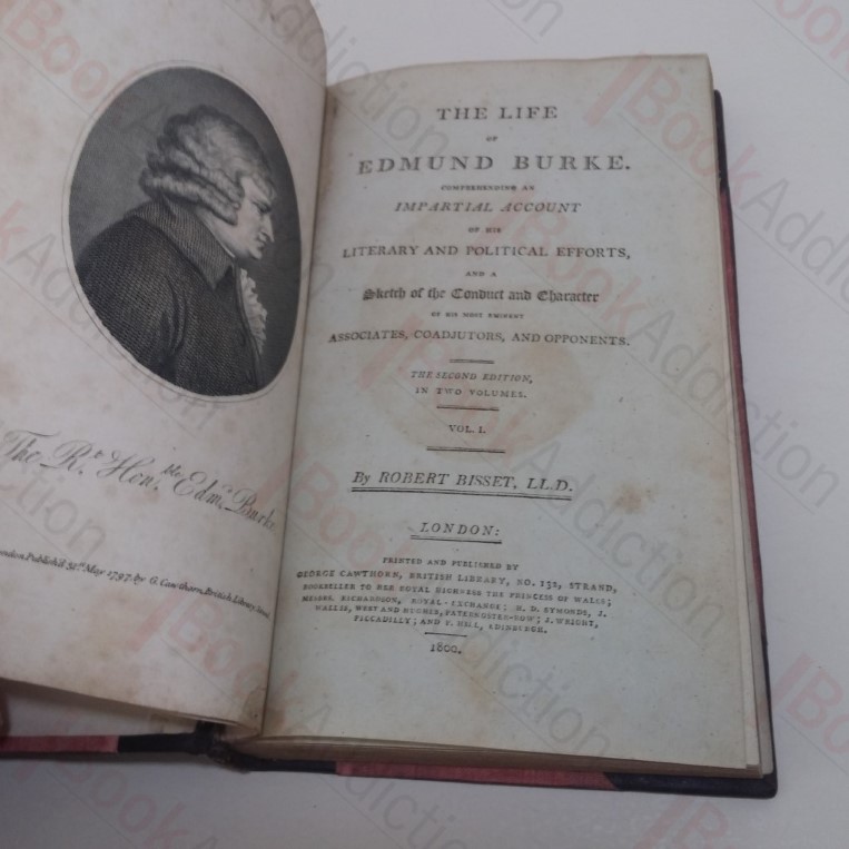 2nd edition. Complete in two volumes. Volume I: xx, 458, with engraved frontispiece. Volume II: x, 462 x pp. Both volumes uniformly half bound in black leather over black cloth-covered boards. Speckled text block edges. 8vo. Boards heavily worn, mottled over spine, rubbed and rounded at corners and spine ends.. Volume I has some cracking in leather over spine. Hinges cracked. Some old water contamination has left a little staining and warping affecting first few leaves on both volumes. Volume II lacks both free endpapers. A little spotting and very mild toning. A little grubby in places. An evocative set of this early and important work on the life and works of Edmund Burke, hard to find.