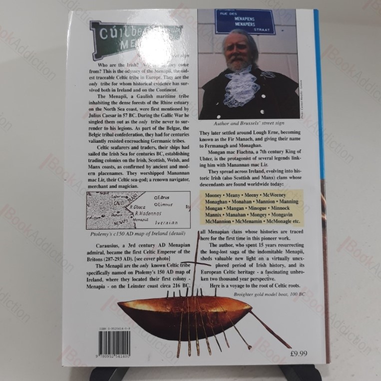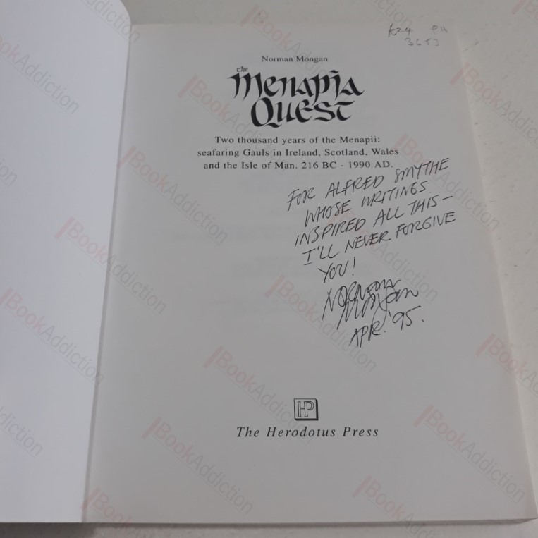 xviii, 214, numerous black and white photographs and maps. Printed card covers, with only the slightest shelf wear. Inscribed by the author on the title page “For Alfred Smythe…” 8vo. Two Thousand Years of the Menapii – Seafaring Gauls in Ireland, Scotland, Wales and the Isle of Man, 216 BC-1990 AD. This is the odyssey of the Menapi, the oldest traceable Celtic tribe in Europe.
