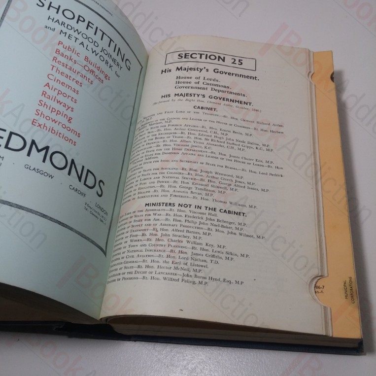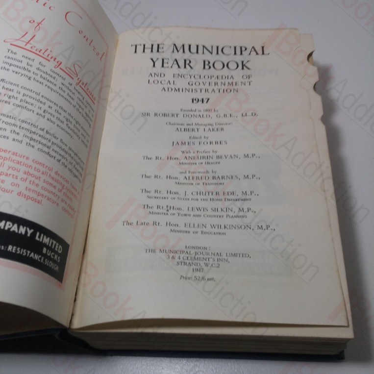 The Municipal Year Book was an annual publication, starting in 1897, being an offical reference to all forms of government, local government and public adminstration.  This volume shows the contemporary concern with social regeneration following the second world war and the enlarged sphere of public activities which went with that.