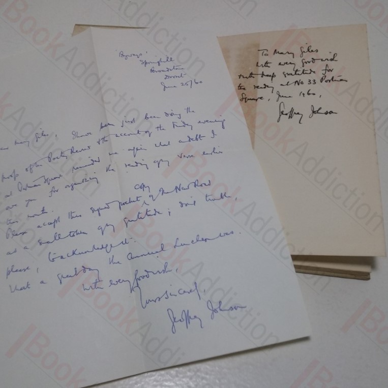 52pp. Green cloth-covered boards, brown titles on spine. Very lightly bumped spine ends. Text block edges starting to fox. Free endpapers tanning. Signed by author on half-title page and also Signed and inscribed to Mary Giles on front free endpaper. Internally neat, clean, bright and tight. Paper dust jacket spine sunned, has shelf wear, chipping to edges, price unclipped. 16mo. New collection of short poems with Mr Johnson’s faith in man not blinding him to the darker aspects of life, as some of the sterner pieces show. Also loosely laid in is a signed letter sent by the author to Mary Giles dated 25 June 1960.