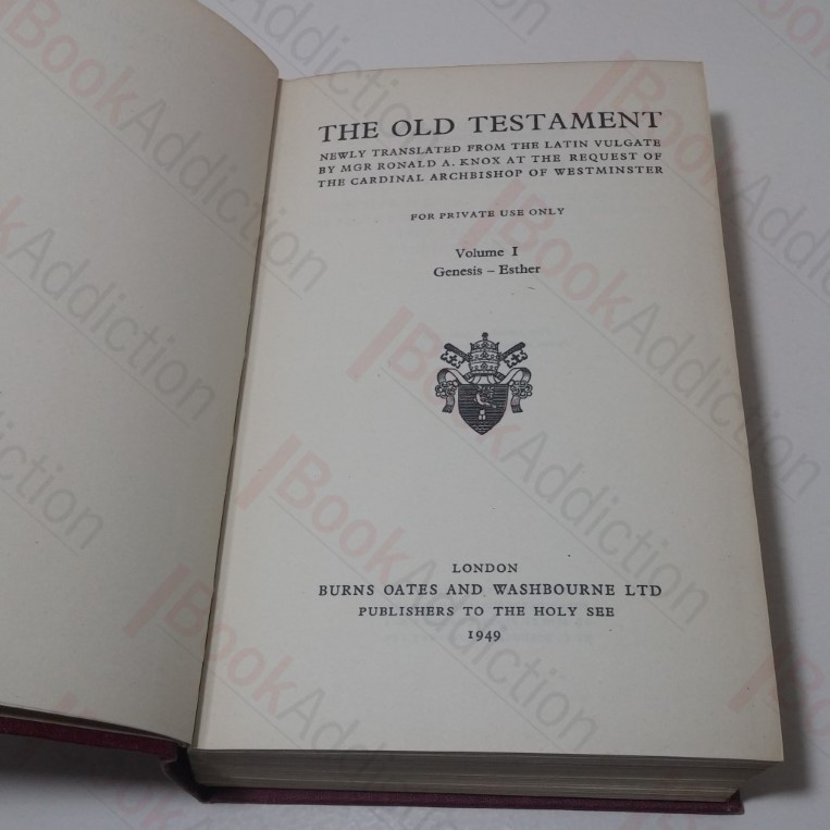 xii, 740pp. Burgundy cloth-covered boards; gilt titles on spine. Top edge sprayed red. 8vo. Sun-faded spine and board edges. Very lightly bumped and rubbed spine ends. Very light wear at board edges and corners; cocked. Dusty top text block edge, remaining edges just starting to tan. Endpapers lightly foxed and tanned. Hinges stretched at endpapers; gutter cracked at page 708. Internally neat, clean and bright. Dust jacket sun-faded, has shelf wear; chipping to edges; 2cm loss at spine heel and lower rear; loss at mid spine and closed tears at spine head; not price clipped. Translated at the request of the Cardinal Archbishop of Westminster. The cover design was reproduced from ‘the engraved title page of the folio edition of the Latin Vulgate, published by the Vatican Press in 1592.’ (Dust jacket)