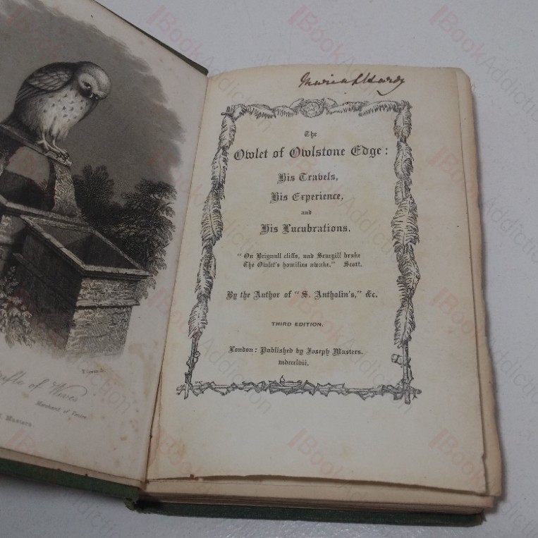 286pp, 36pp, publisher’s ads. Green cloth-covered boards; blind-embossed design on boards, gilt illustration and titles on front and spine; brown endpapers. 12mo. Sun-faded, heavily rubbed and bumped extremities with cloth worn through. Top text block edge dust damaged, remaining edges tanning; very cocked. Gutters cracked and strained, volume loose, pages tanning. Otherwise, internally neat and clean.