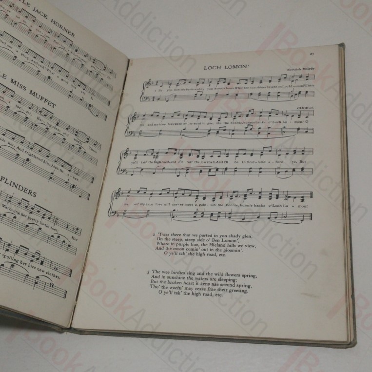First edition, second impression. iii, 62pp. Green cloth-covered boards; black titles in border on front, black titles on spine. 4to. Heavy wear to all extremities with cloth worn through. Text block edge dusty. Endpapers lightly foxed and tanned. School’s rubber stamps on front endpapers. Hinge stretched at front and gutter cracked midway, volume slightly loose. Internally pages have occasional user’s marks otherwise neat, clean and bright. Contains 111 Nursery Songs with accompanying music scores.