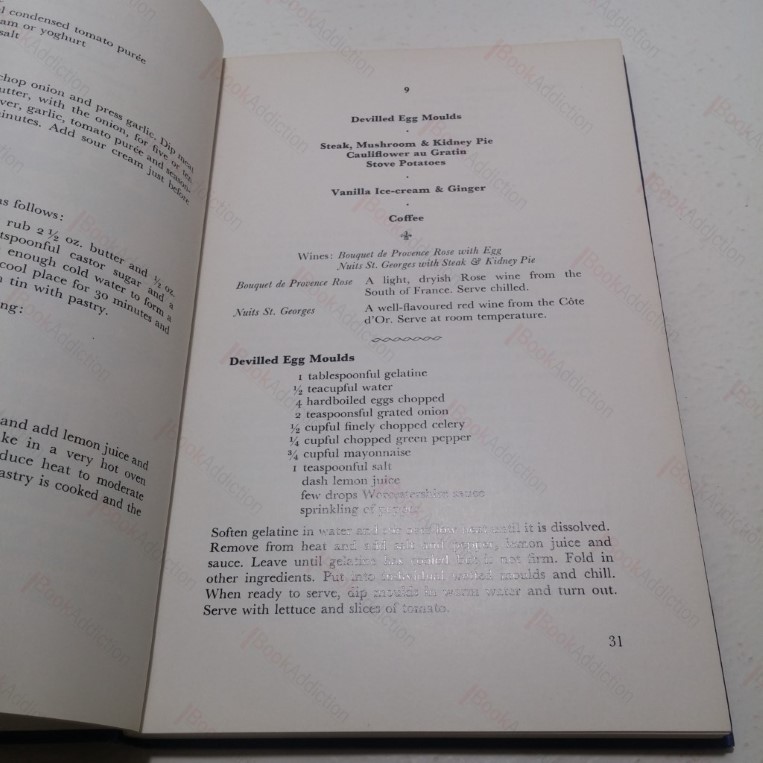 176pp. Blue cloth-covered boards, gilt titles on front and spine. Bumped spine ends. Lightly bumped bottom corners. Internally neat, clean, bright and tight. Dust jacket has tears (mainly closed) and folds. Intact other than three small sections missing, price unclipped. 8vo. Complete menus with suggestions for accompanying wines, as well as ideas for afternoon tea parties, younger children’s parties, cheese and wine parties etc – written for the 1960s hostess.