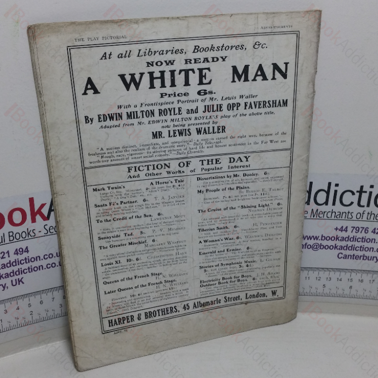 The Play Pictorial was a monthly London theatrical magazine. There were 446 issues in total, with the first published in April 1902 and the last in September 1939. It was first edited by Rudolph Birnbaum (from April 1902 to April 1904), then by Frank M Boyd. then Fred Dangerfield. In 1906, after Benjamin Findon became editor, a position he retained until the journal folded on the outbreak of the second world war. The Play Pictorial showcased, with largely pictorial features, contemporary West End theatre productions, with each issue providing a detailed record of a single show. It described plot, costumes and sets, and had numerous photographs of the cast and scenes from the production. For musicals, some of the lyrics and short extracts from the scores were included. This issue features a 1907 production of A White Man starring Nora Lancaster and Lewis Waller as the Countess of Kethill and James Wynnegate respectively.