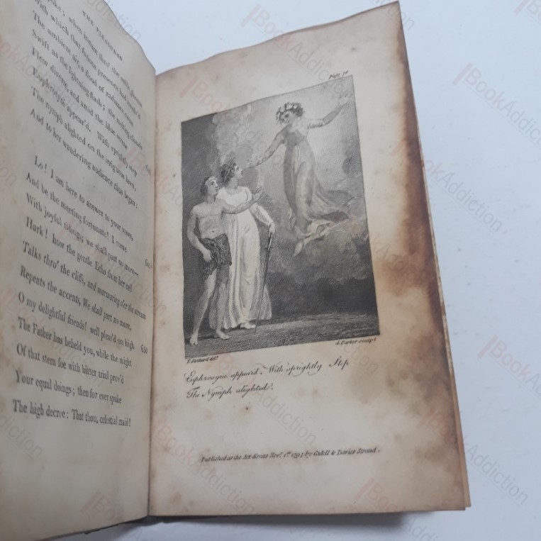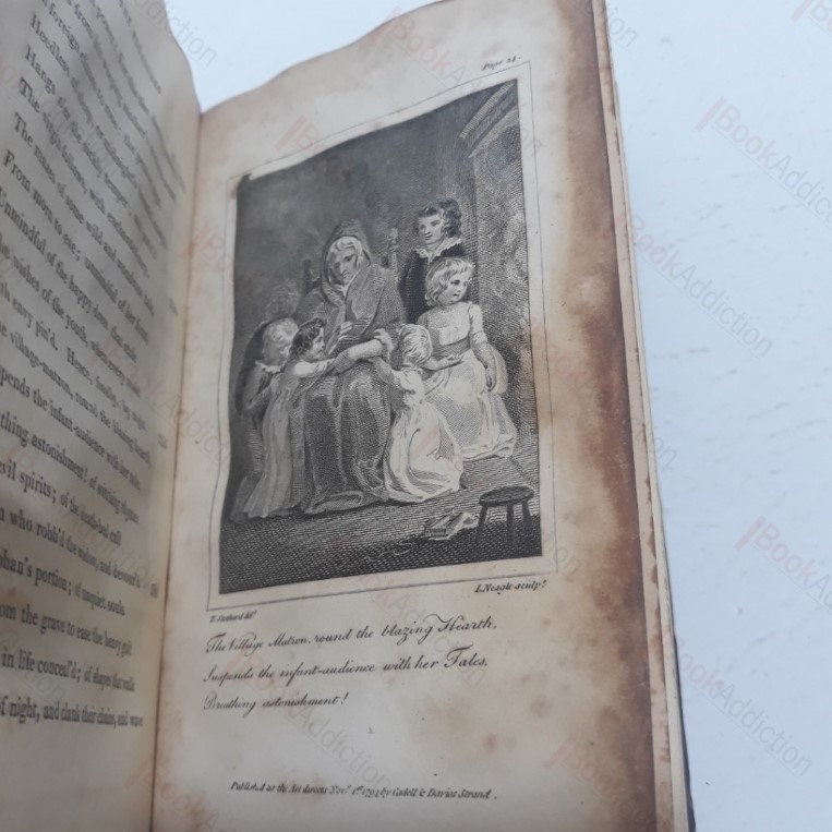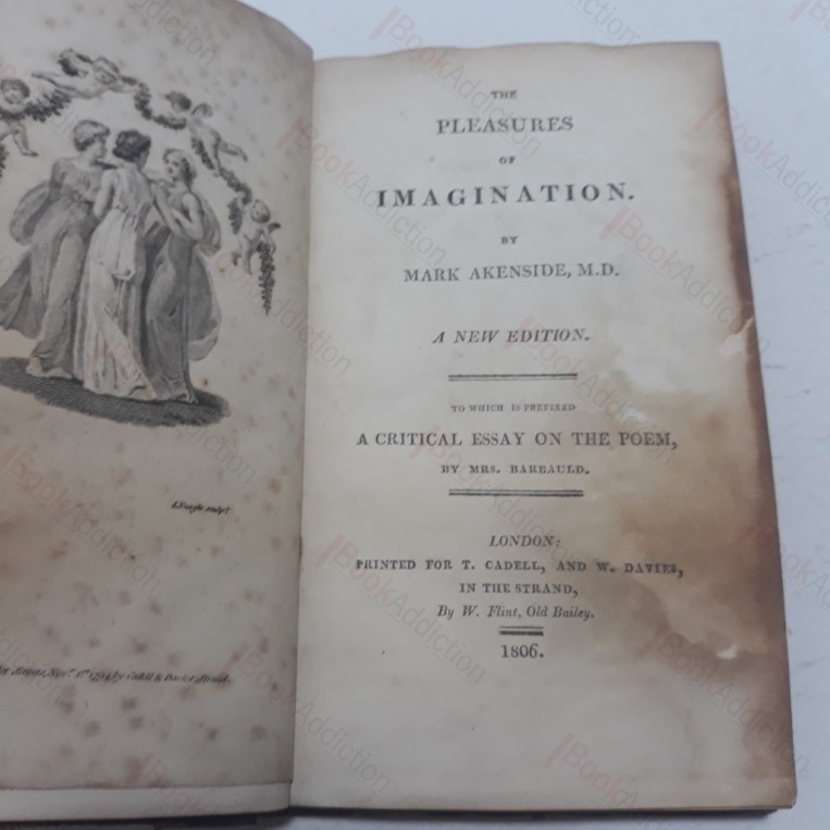 A new edition. 160pp. Steel engraved frontispiece, depicting the three Muses, with three further full page steel engravings, all take from the 1794 edition of the same work. In a near contemporary half leather binding, deep brown leather over marbled boards, gilt lettering on title label on spine. Coloured, possibly replacement, endpapers. (Boards worn and rubbed at edges, some mild chipping and scuffing to leather, patchily faded. Internally, some pages affected by old damp, which has browned some page edges; spotting and some rusting on prelims, especially frontispiece, else neat and tidy, and firmly bound. 12mo. A good, early example of this compelling, didactic poem, with an early critical, if not entirely objective, critical study. “It is a work that offers us entertainment, but not of an easy kind”. Akenside took his inspiration for this work from the essays of Addison on the same topic, which had previously been published in the Spectator magazine.