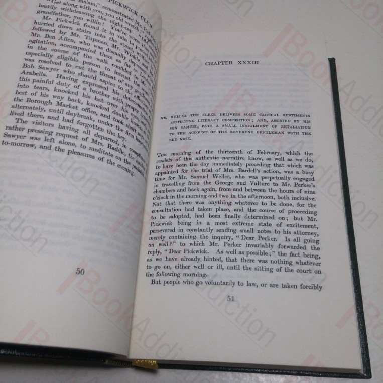Two volume set. Vol 1: 484pp, Vol 2: 478pp. Green leatherette-covered boards, gilt decoration and lettering on front and spine, silk page markers. Pages just starting to tan. Pictorial endpapers. Internally neat, clean, bright and tight. 8vo. Introduction by Bernard Darwin. Illustrations by Phiz and Seymour. Written originally for publication as a serial this was Dickens first novel and introduces us to the delightful Mr Pickwick, founder of the Pickwick club and relates the travels of Pickwick and his friends across the English countryside.