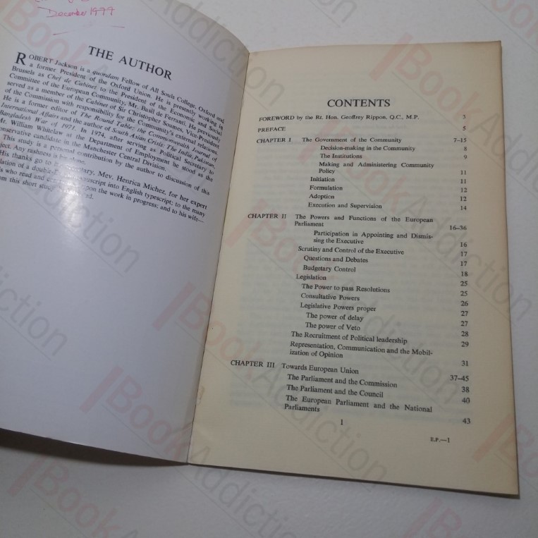 46pp. Printed light card covers. Light chipping to edges. Tanning to edges of covers. Previous owner’s name inside front cover. Pages tanning, text clear. 8vo. Foreword by Geoffrey Rippon. Explains clearly the existing functions of the European Parliament.