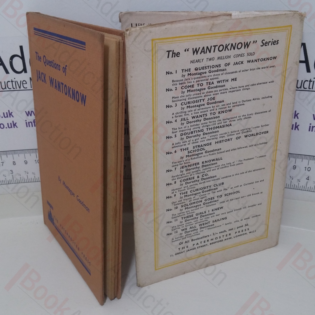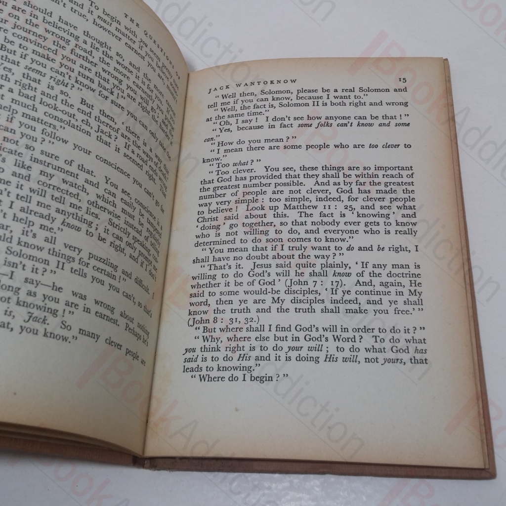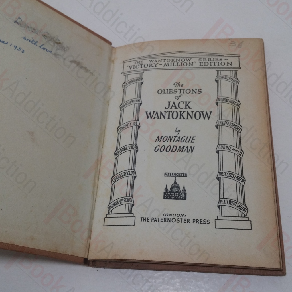 60pp. Peach cloth-covered boards; blue titles on front and spine. 12mo. Volume askew. Text block edges tanned; affecting page margins. Gift inscription on front pastedown (names removed – paper damaged). Internally neat, clean, bright and tight, barring occasional foxing. Dust jacket has light shelf wear, chipping to edges, price clipped. Written for young people with inquiring minds, the book deals with Christian questions such as “How do we know the bible is true?” and “Why not fight your enemies?”