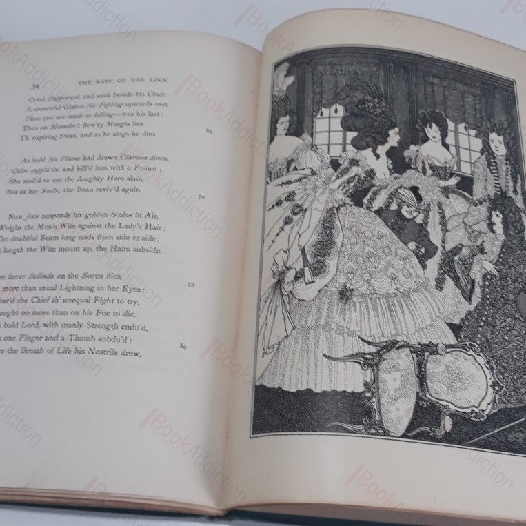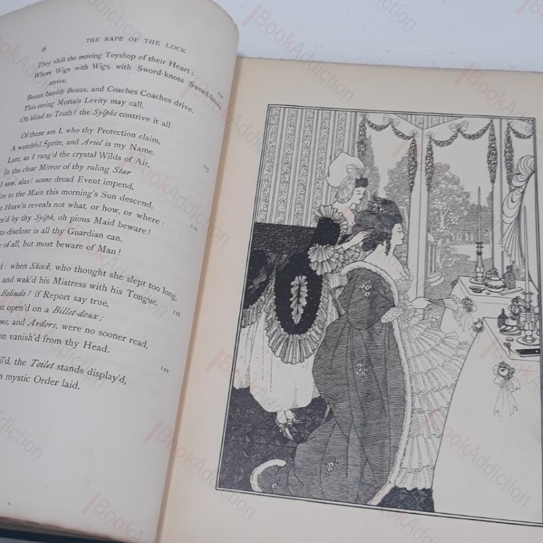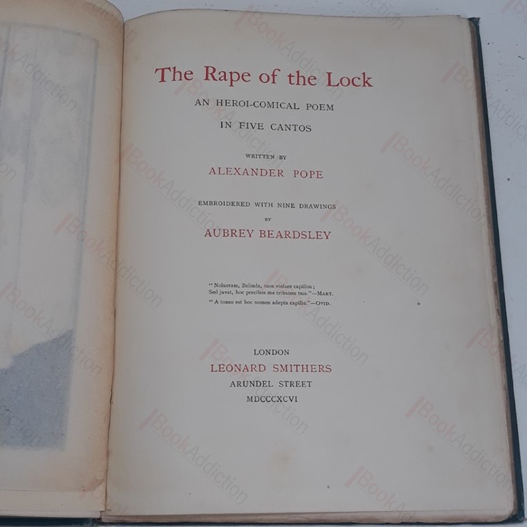 1st edition, 1st state. 48pp, embroidered with nine full page drawings by Aubrey Beardsley (frontispiece with tissue guard). Green cloth boards with elaborate and extensive gilt decorations, bevelled edges, top edge gilded, all other page edges deckled. (Boards a little rubbed, mildly scuffed at corners and spine folds). Bookplate on front paste down, a little toning to pages, especially the tissue guard over the frontispiece, a couple of chips to page edges. Overall a very good clean and strong copy of this new edition of Pope’s Rape, with Beardsley illustrations. One of the extraordinary products of Beardsley’s Annus Mirabilis of 1896. The Rape of the Lock was first published in 1712 by Bernard Lintott, at the sign of the Cross-Keys, between the two Temple Gates. Fleet Street. It was then in two cantos. It was occasioned by a frolic, carried rather beyond the bounds of good breeding, in which Lord Petre cut of a lock of Mrs Arabella Fermour’s hair. The poem was undertaken at Mr Caryl’s request in order to reconcile the two families. Such was its success, Pope was induced to extend it to five cantos by the addition of the machinery of sylphs and Gnomes. Those readers anxious to be acquainted with the original form will find its extent indicated in Pope’s notes to the poem, which are printed in this volume at the end, with Pope’s final revisions. First edition, 1st state : ‘Leonard Smithers’ at base of spine, without the ‘& Co’ (see Samuels Lasner, p. 105).