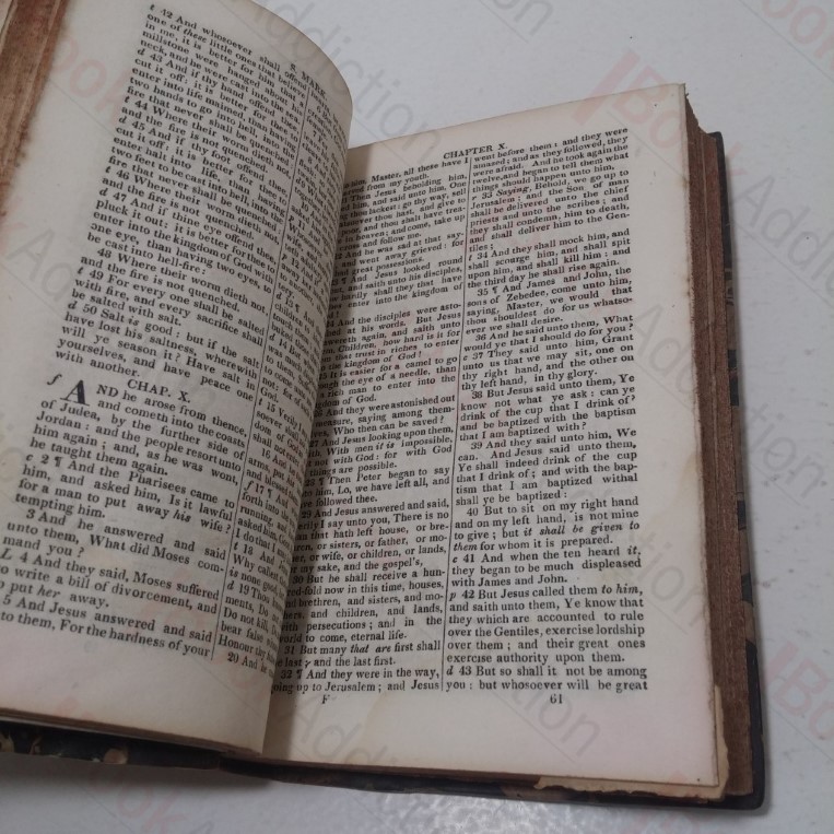 324pp, 18pp of tables, 112pp Scripture Text Book; three fold-out maps. Half-bound in brown leather over marbled paper-covered boards, gilt titles on spine; speckled text block edges, marbled endpapers. 16mo. Lightly rubbed/bumped spine ends. Rear board bowed. Dusty top text block edge, remaining edges just starting to fox. Verso of free endpapers starting to fox and tan. Internally neat, clean, bright and tight; barring occasional foxing throughout. Includes outlines for bible-class instructions, table of proper names, accented for correct pronunciation, geographical table, chronological table, table of reference to the Prophecies and a miscellaneous table by Hervey Wilbur. Bound into same copy is the Second Edition of Scripture Texts arranged for the use of ministers, teachers, visitors etc, adapted for binding with the pocket bible, compiled by the Religious Tract and Book Society for Ireland. Published by Philp Dixon, Hardy and Sons, Dublin 1846.