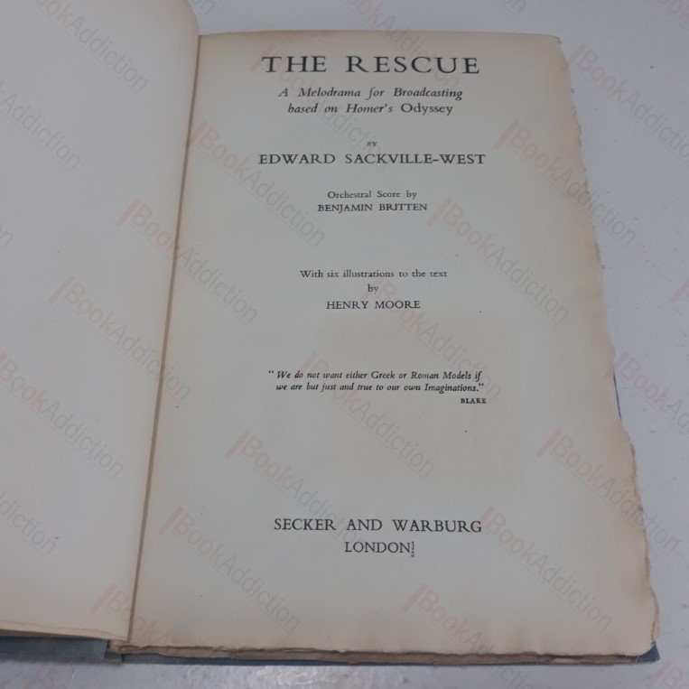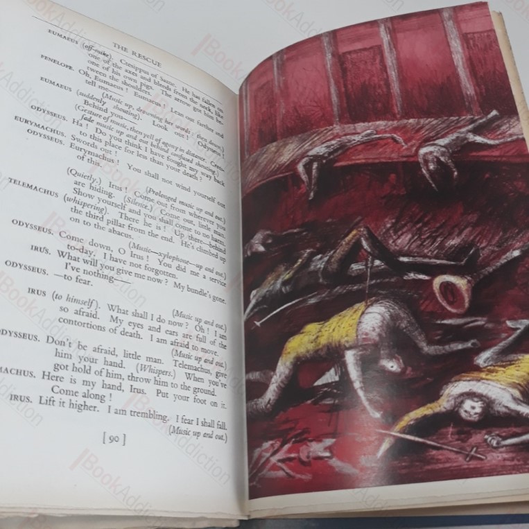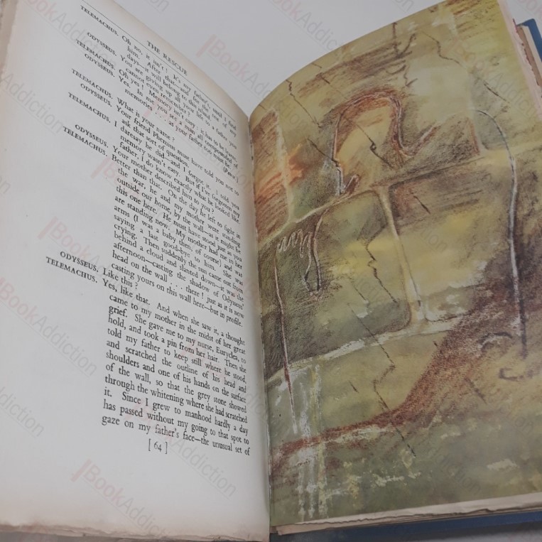 96pp, six plates, four in full colour all by Henry Moore. Blue cloth-covered boards with gilt titles on spine. Water mottled spine, leaching to boards. Mildly rubbed spine ends. Bottom corners rubbed. Gilded text block top edge. Dust jacket rubbed, with section at head of spine missing and top rear corner. Closed tears along top and at heel of spine on rear. Evidence of removed labels on front end papers. some tannin to page edges. No. 143 of an edition limited to 850 copies, printed on hand-made paper. Original script, with musical cues, of the radio melodrama based on The Odyssey which was broadcast in 1943.