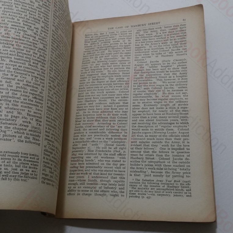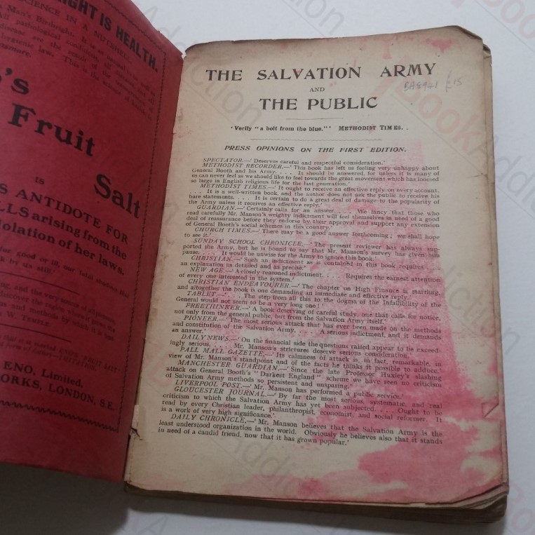 2nd, augmented edition. 198pp. In soft card covers with black titles (covers are worn and faded, rubbed on edges, scuffed and rounded at corners, cracked along spine, with a small portion at the base of the backstrip missing, some creasing). Generally softened. The red from the card covers has leached onto the first and last couple of pages. Pages well-thumbed with a hint of toning at edges. A good reading and research copy, albeit no longer pretty. Three small newspaper clippings loosely laid in, dating from the time of the first world war and commenting on the role of the Salvation Army at that time. A critical examination of the development and work of the Salvation Army.