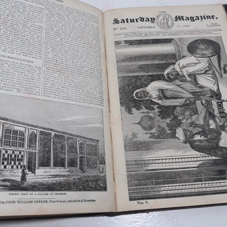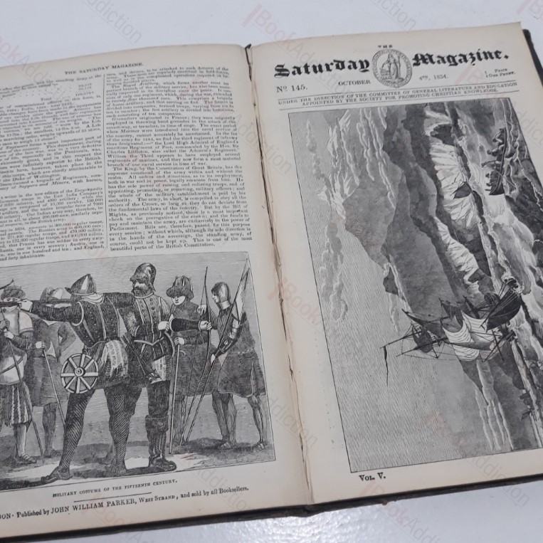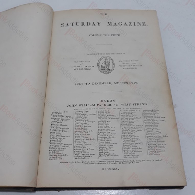 260pp with dozens engraved illustrations in black and white. Half bound in brown leather over marbled paper-covered boards, gilt text and design on spine. Leather on spine head torn and corners worn through, considerable bumping to bottom. Weekly magazine published under the direction of the committee of general literature and education and appointed by the society for the promoting of Christian knowledge. Articles and engravings indexed. 4to