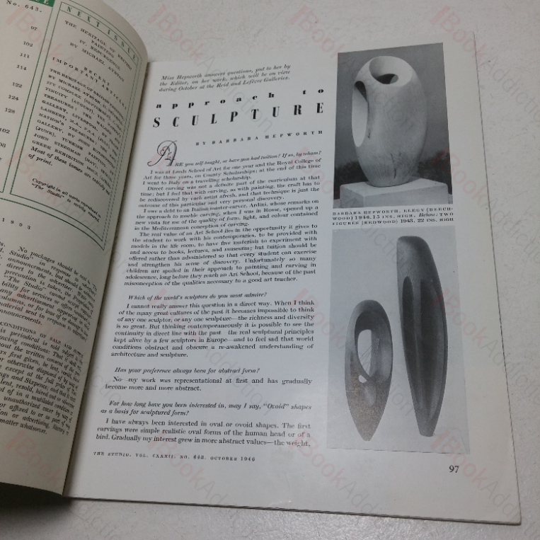 The Studio was a fine and applied arts magazine, first published in 1892. This issue contains feature articles on Approach to Sculpture by Barbara Hepworth, Lawrence Gowing, The Slade School of Fine Art, Craftsmanship in Leather Binding etc.