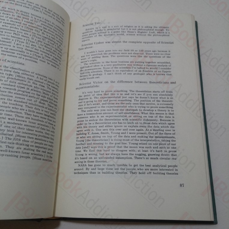 330pp. Green cloth-covered boards, white titles on spine. Lightly bumped spine ends. Internally neat, clean, bright and tight. Dust jacket in *** envelope, has 1cm closed tear at top front, some shelf wear, chipping to edges, mirrors book damage. 8vo. The results of over 270 hours of taped recorded interviews with more than forty of the most eminent scientists who studied the moon rocks.
