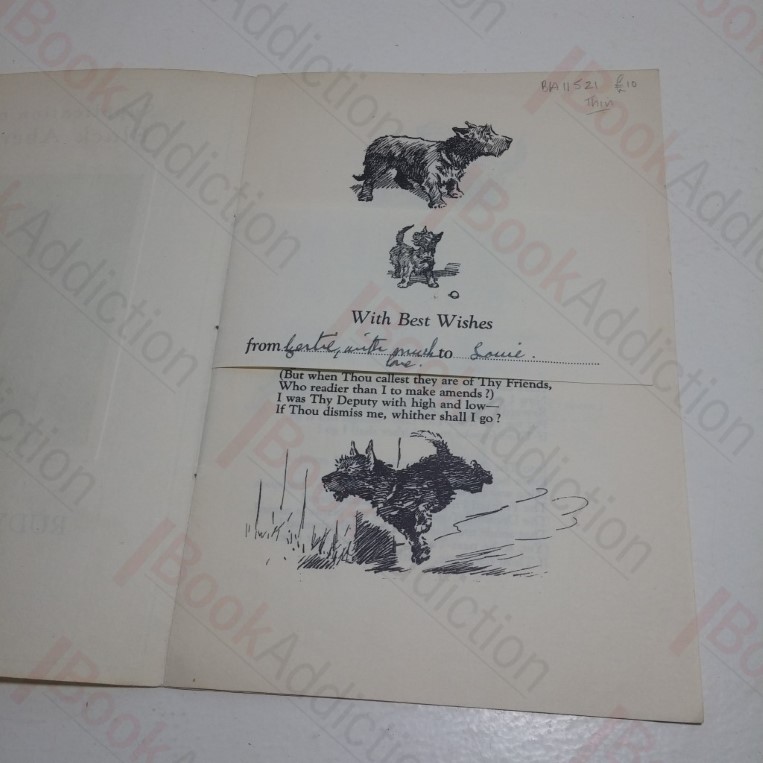 c. 1930. 14th impression. A delightful 4pp, illustrated booklet containing Kipling’s tributory poem to the Black Aberdeen dog, bound with strong cord, and with an illustrated gift slip (completed), bound in. Covers a little soiled and gently rubbed at edges, small mark on verso. Internally a few mild signs of reading wear, else neat, clean and tight. Charming booklet with delightful illustrations of the terrier dog. 8vo.