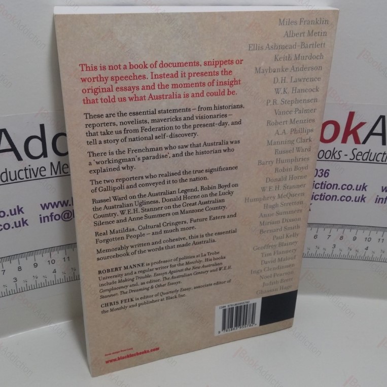 260pp. Laminated printed light card covers. In as new condition throughout. 8vo. Presents the original essays and the moments of insight that told us what Australia is and could be – with essential statements from historians, reporters, novelists, mavericks and visionaries – taking us from Federation to the present-day.