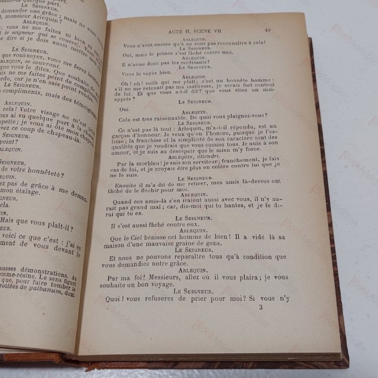 368pp. Includes the French plays, all comedies, La Double Inconstance; Le Jeu de L’Amour et Du Hasard’ L’Ecole des Meres; Le Legs; Les Fausses Confidencesl La Sinceres; L Epreuve. Quarter bound in tan leather over marbled boards, red spine title label with gilt lettering. (Boards a little rounded at corners, lightly rubbed at spine ends). Internally a little page toning, else clean, neat and robust. Attractive copy. 12mo