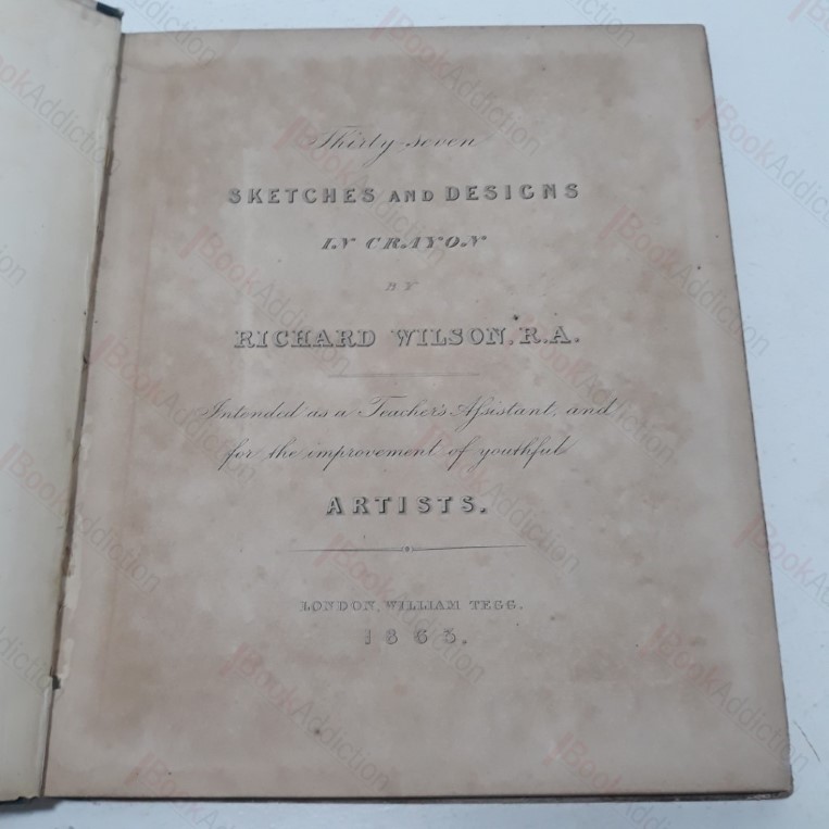 Unpaginated bound portfolio of Wilson’s crayon drawings. Quarter green cloth over printed paper-covered boards. Spine bumped and cloth torn at ends, cloth torn in two places on spine. Corners slightly turned in and edges bumped and paper worn to boards. Marks on and tape repair to front end papers. Boards worn all over. Gutter strained at title page and rear end paper. Foxing to title page; spotting on some pages. Finger marks especially on early pages. 4to. Intended as a teacher’s assistant and for the improvement of youthful artists.
