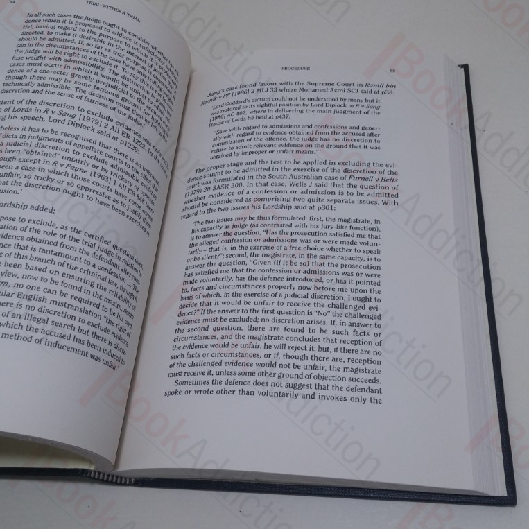 xxx, 282pp.  In black cloth-covered boards with gilt lettering on the spine.  8vo.  Mild ridge on front free endpaper, else neat, clean, bright and tight throughout.  In its original illustrated dust jacket, gently bumped at edges, creased on inner front flap.  A consideration of the laws relating to the admissibility of evidence, such as confessions and cautioned statements, as commonly featured particularly in Singaporean and Malaysian criminal justice.  A significant section considers also the waiver of a requirement for a trial within a trial to establish admissibility.
