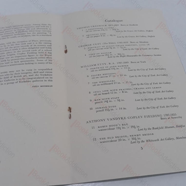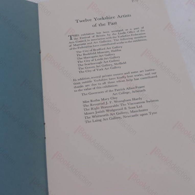 8pp. Booklet, stapled with stiff card covers (very gently worn and a little toned around spine). Internally neat, clean, bright and tight. Catalogue issued to accompany the 1951 exhibition in Leeds, as a part of the Festival of Britain; artists include Thomas Creswick, George Cuit, William Etty, Anthony VanDyke Copley Fielding; John Flaxman; Julius Caesar Ibbotson; John William Inchbold; John Jackson; Francis Nicholson; Francis Place; Charles Henry Schwanfelder and Benjamin Wilson; with an introductory essay indicating how the Yorkshire Artists included in the exhibition represent some of the ‘foothills’ of the British School of Art.
