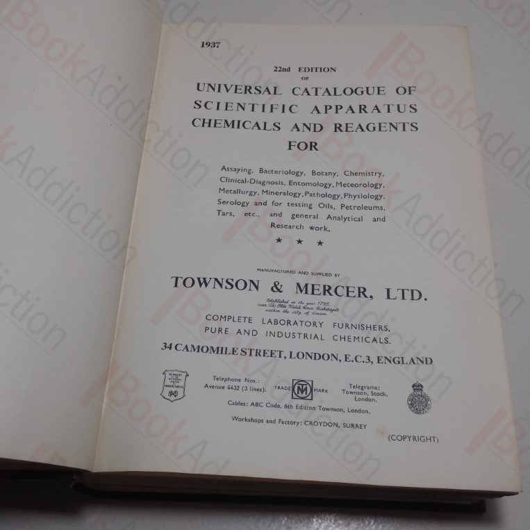 1,314pp. Quarter bound in burgundy cloth over maroon cloth-covered boards; white titles on front, gilt titles on spine. 4to. Cocked. Signs of used on text block edges. Endpapers foxing. Internally neat, clean, bright and tight. For assaying, bacteriology, botany, chemistry, clinical-diagnosis, entomology, meteorology, metallurgy, mineralogy, pathology, physiology, serology, and for testing oils, petroleums, tars, etc and general analytical and research work.