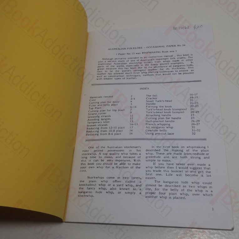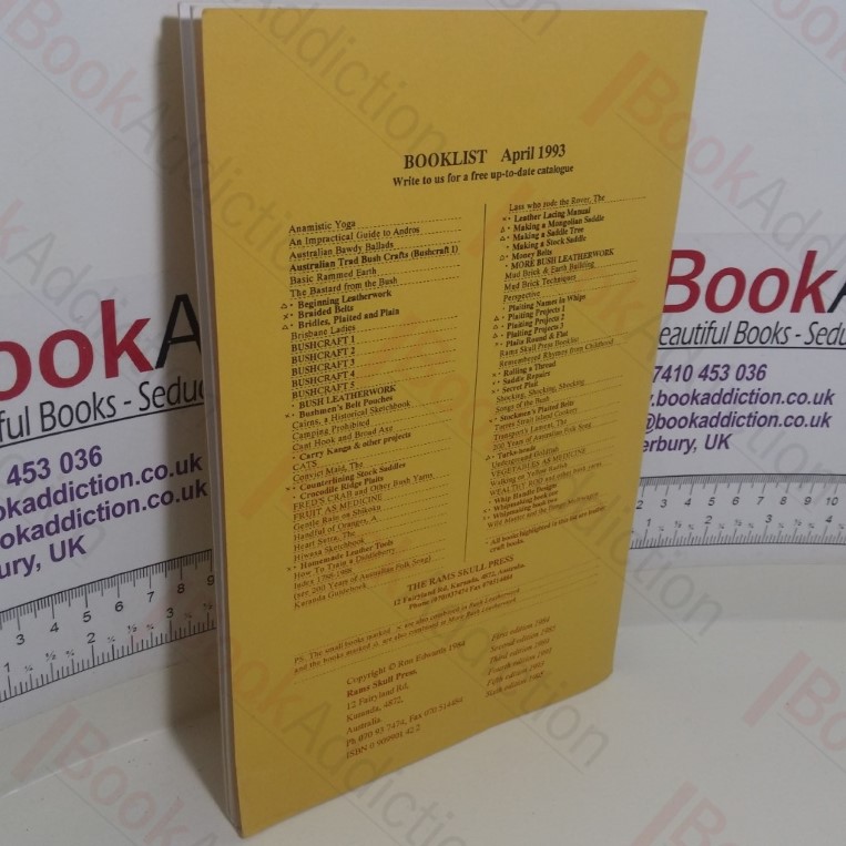 32pp, illustrated. In card wrappers (a little rubbed in places). Internally neat, clean, bright and tight. A well-illustrated guide to making Kangeroo Hide Stockwhips, but also the result of research into traditional Australian crafts and bush crafts; a serious study of one of Australia’s important folk crafts. Slim 8vo.
