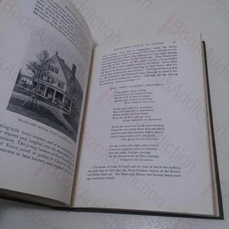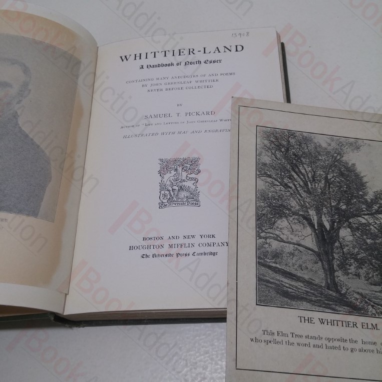 160pp. Green cloth-covered boards; gilt design on front, gilt titles on front and spine; top text block edge gilt. 12mo. Rubbed spine ends; cloth wearing. Text block edges starting to tan and fox. Endpapers starting to fox and tan. Previous owner’s name on front free endpaper. Internally neat, clean, bright and tight. Written at the turn of the century for the tourist visiting the Whittier shrines at Haverhill and Amesbury, Massachusetts. Includes a card with a picture of the Whittier Elm on the front and a poem entitled The Elm Tree on the reverse written by Martha F. Thompson.