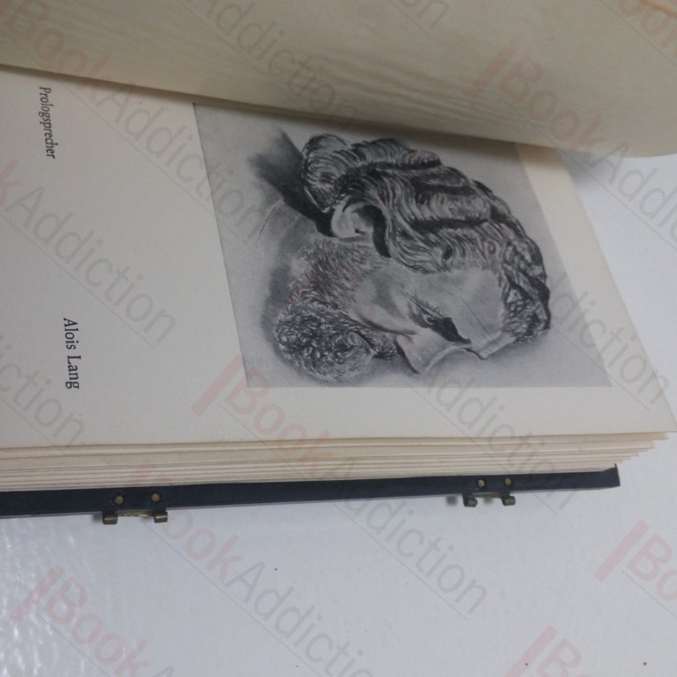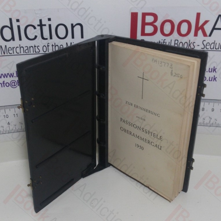 [6], plus 16 tissue-guarded prints. Bound in a metal case with gilded clasps, stamped and gilded decorations, four raised bands. 16mo. Catches on clasps missing, minor & faint spotting on title page, which has been gently bumped at base. One tissue-guard has been an outline of the following printed drawn on, else internally neat, clean, bright and tight. An unusual and attractively pleasing volume. With a very brief history of the Oberammergau Passion Play in German, English and French, followed by 16 high quality prints by W Preiss, the majority depicting actors who took part in the play in 1950. Very hard to find, perhaps unique in this beautiful binding.